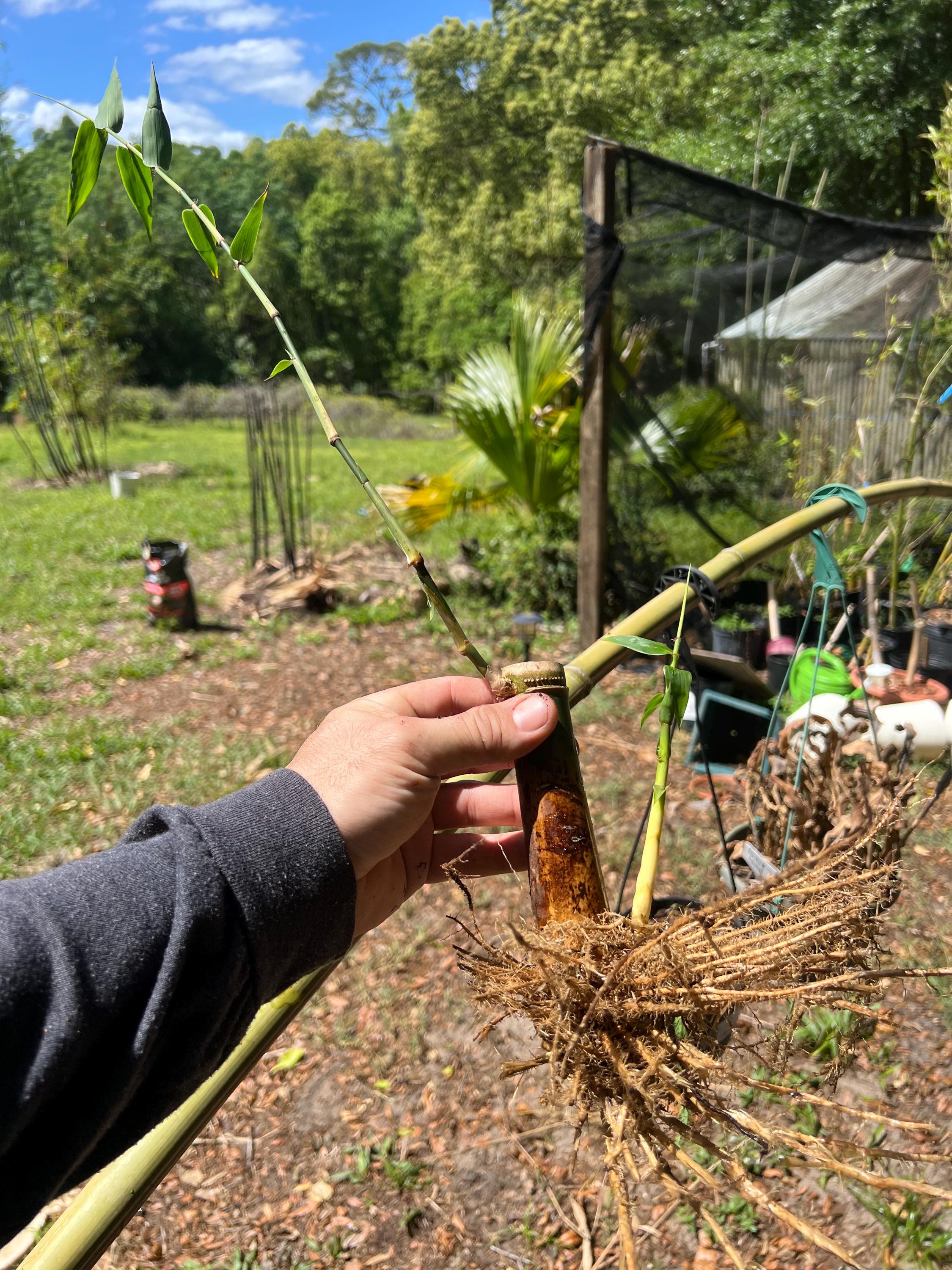 You want to dig holes wide rather than deep. Bamboo likes to stay shallow in the soil, which is why mulch is very important. Bamboo will naturally drop its own mulch as a survival mechanism, shielding its valuable and vulnerable rhizomes from the intense heat of the sun as well as freezing cold temperatures.